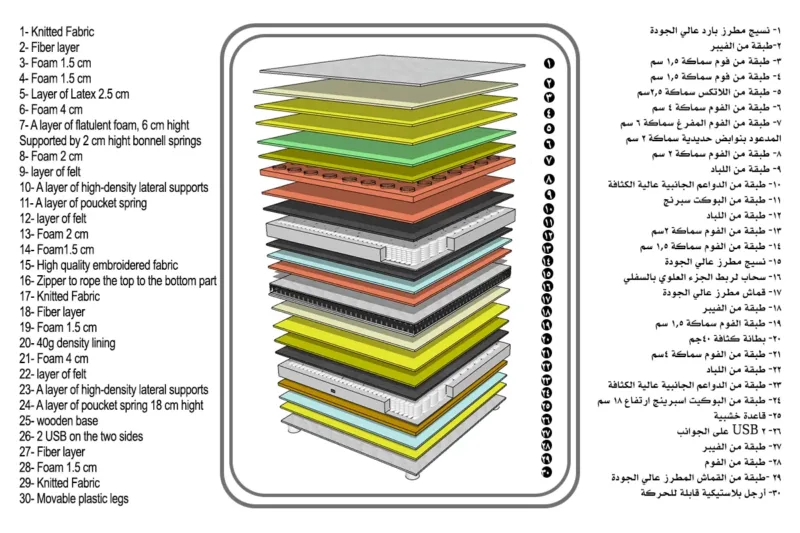 - طبقات المرتبة تم اختيارها بعناية لتلائم وزن الجسم وتمنحه دعم متساوي لكافة المناطق وخاصتاً العمود الفقري