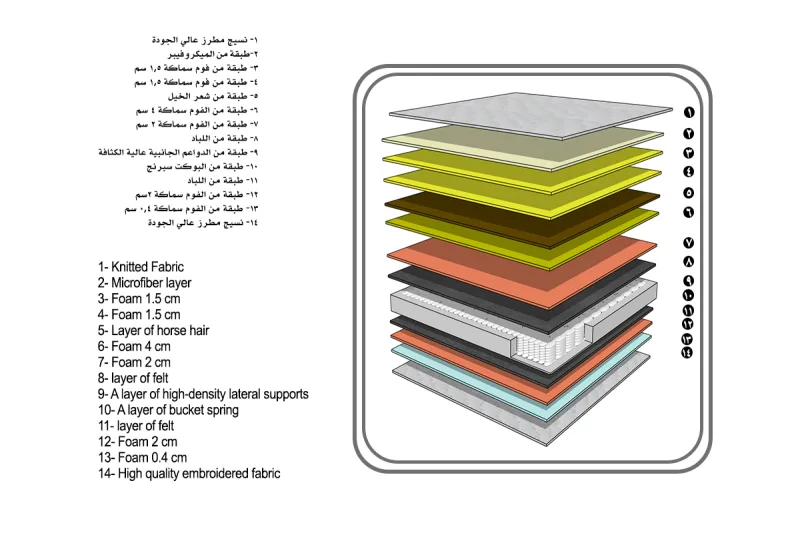 - طبقات المرتبة تم اختيارها بعناية لتلائم وزن الجسم وتمنحه دعم متساوي لكافة المناطق وخاصتاً العمود الفقري
